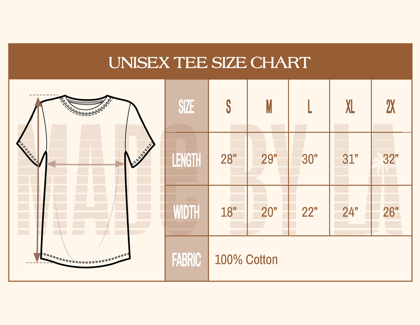 Please scroll through photos for measurements. Our advice: Take your favorite tee at home and measure from armpit to armpit & top shoulder straight down to the waist. Compare those measurements to our size chart and choose the size that reflects that measurement.